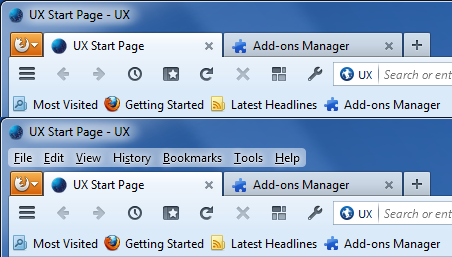 The new appmenu toolbar button can be placed on navigation toolbar, personal toolbar or tabs toolbar. If it is placed on tabs toolbar before or after the tabs container and the menubar is not active or visible, the appbutton appears on browsers titlebar (Windows only). It appears on tabs toolbar, if the menubar is visible (Windows only).