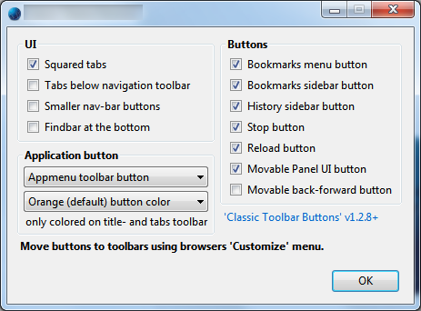 The add-on for Firefox 26+ (Austalis design - Windows, MacOSX, Linux) restores squared tabs, appbutton/appmenu (known from Firefox for Windows), bookmarks menu button, bookmarks sidebar button, history sidebar button and other buttons from Firefox 4-26 (non-UX). All buttons are fully optional and have to be added to toolbars manually. Use browsers 'Customize' menu to move buttons to your favorite toolbar.